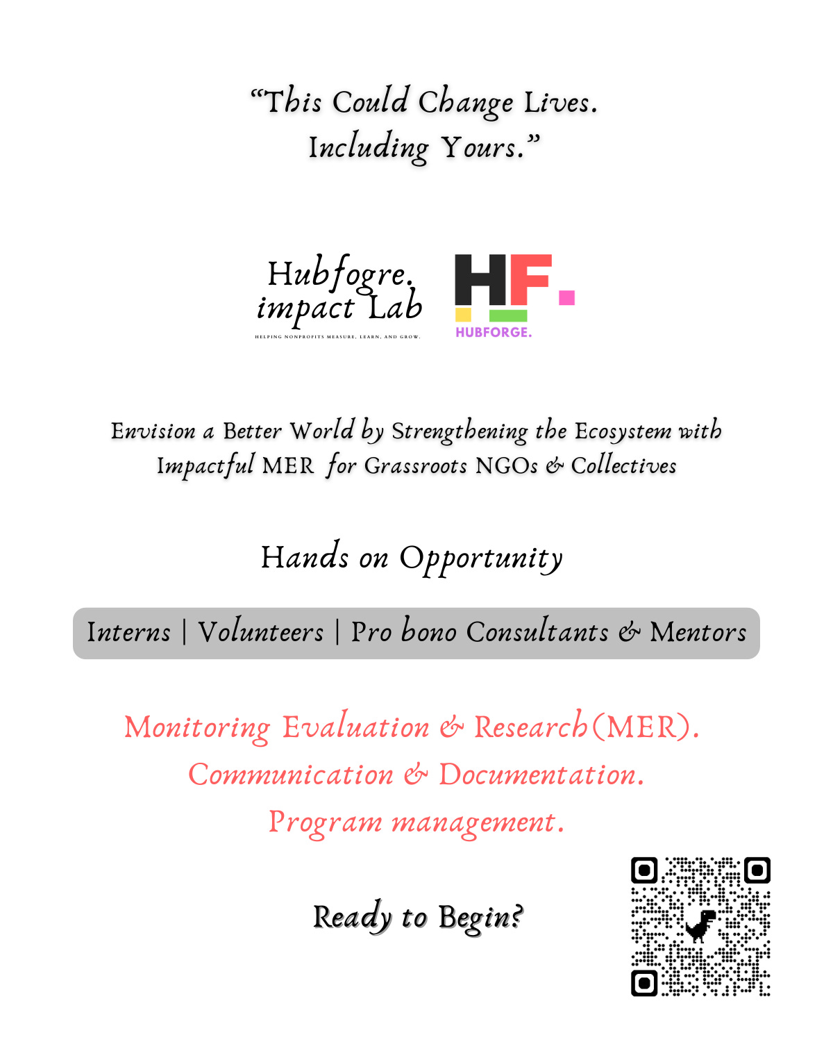 At HubForge. Impact Lab Initiative , We Envision a Better World by Strengthening the Ecosystem with Impactful Monitoring Evaluation & Research for Grassroots NGOs & Collectives.